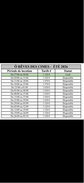Tarifs précis semaine par semaine pour la saison 2026. Réservation directe sans commission, sans frais d'agence.